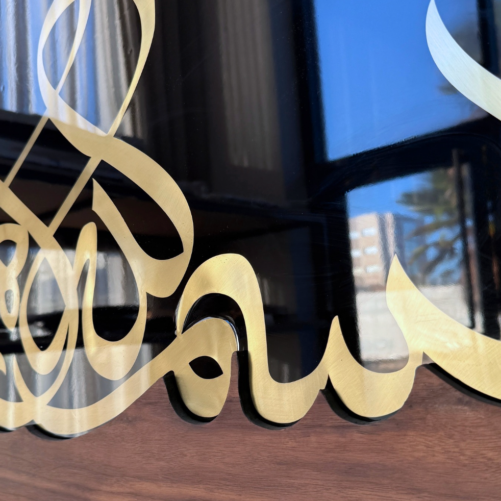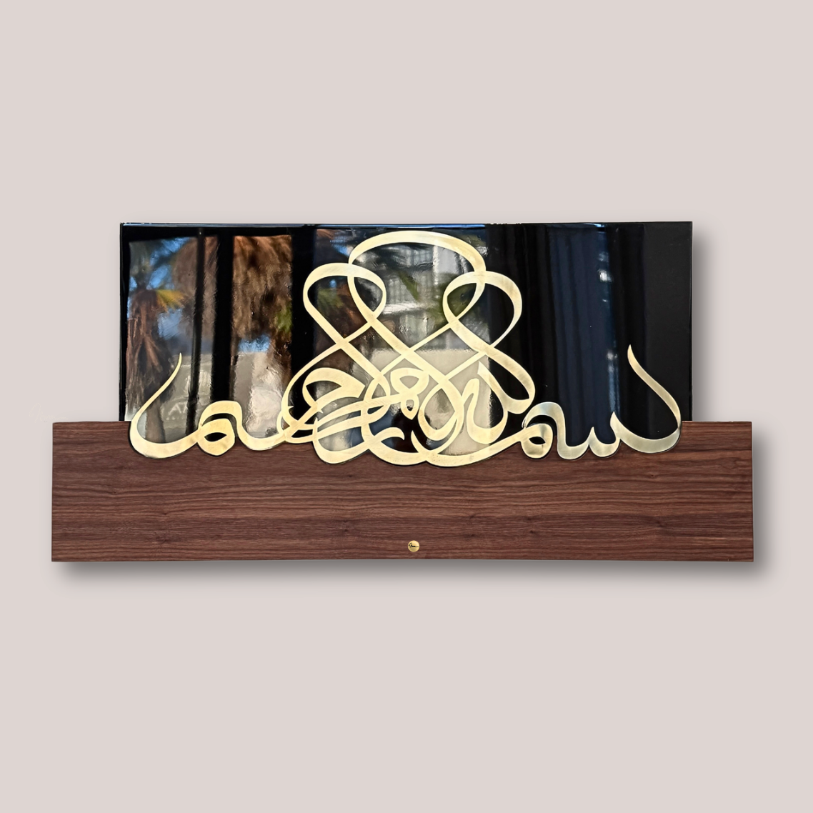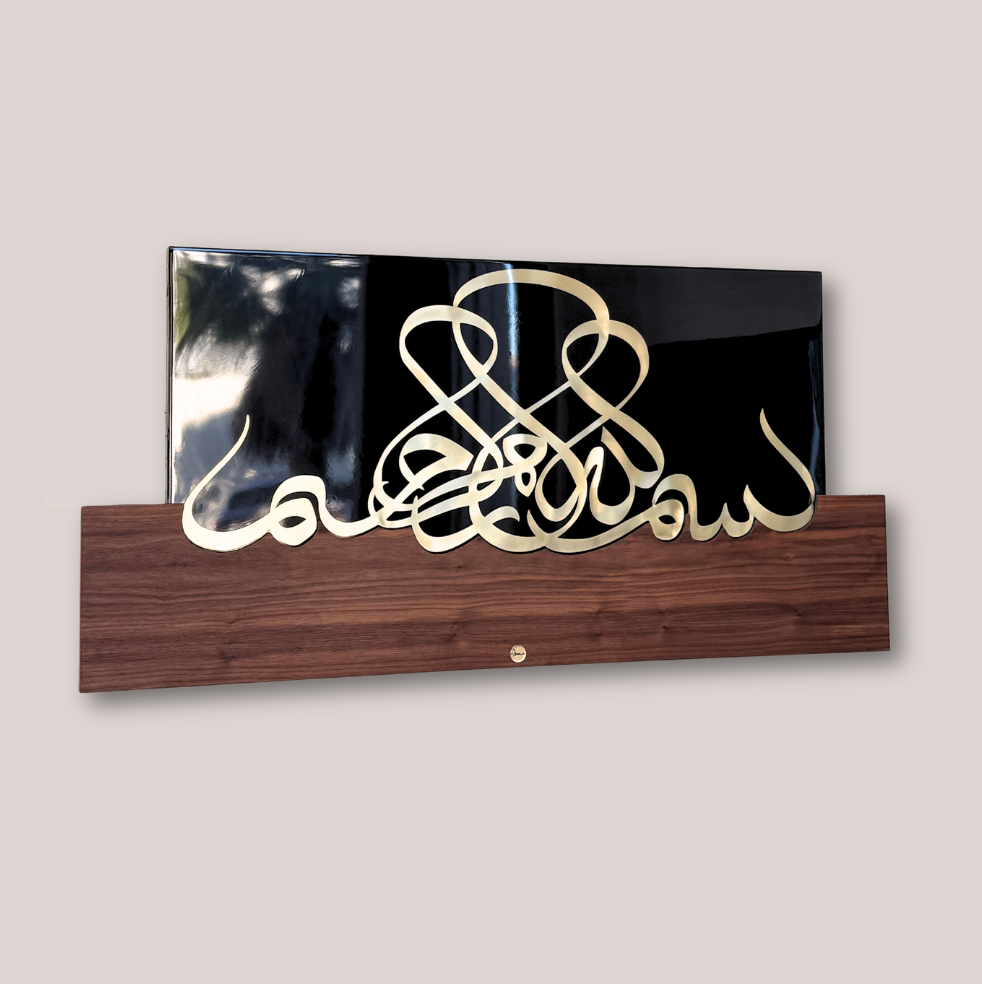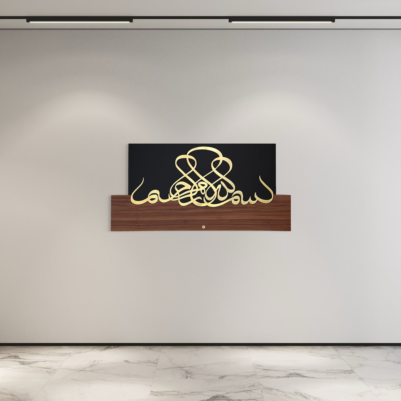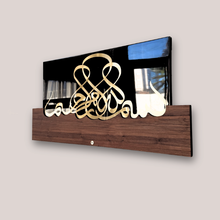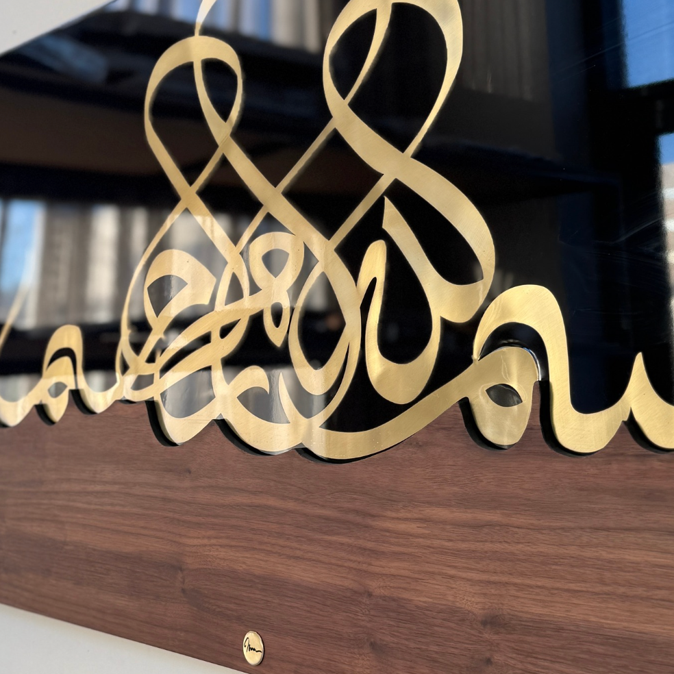 Its elegant golden brass calligraphy emerges from a base of warm walnut wood, representing: