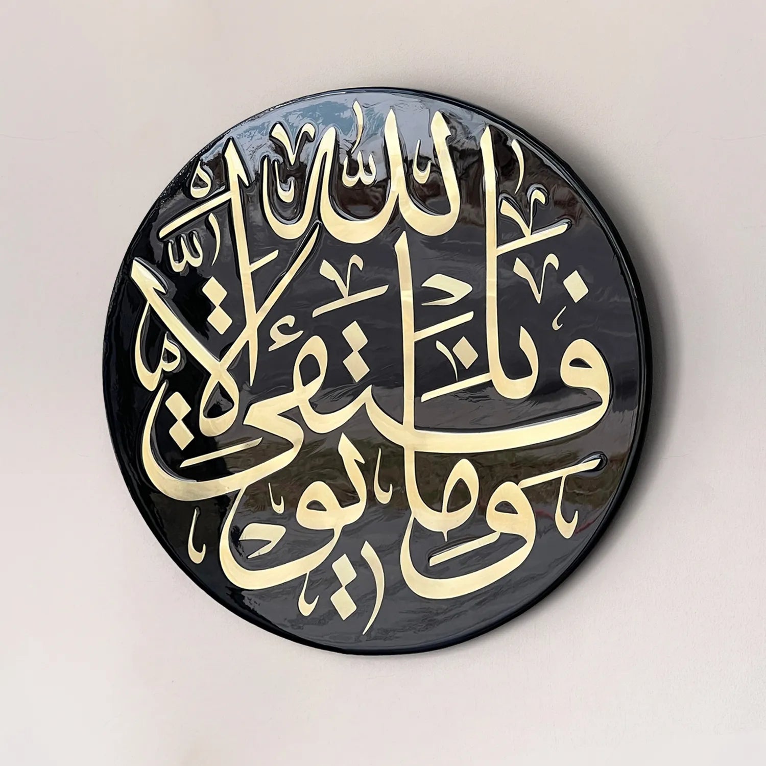 Set within a rich walnut wood frame and infused with deep black epoxy resin, the composition symbolizes both the strength of faith and the mystery of divine decree. The overlapping circle and half-circle frame reflect the interconnectedness of effort and divine guidance—a balance between striving and surrendering to Allah’s wisdom.
