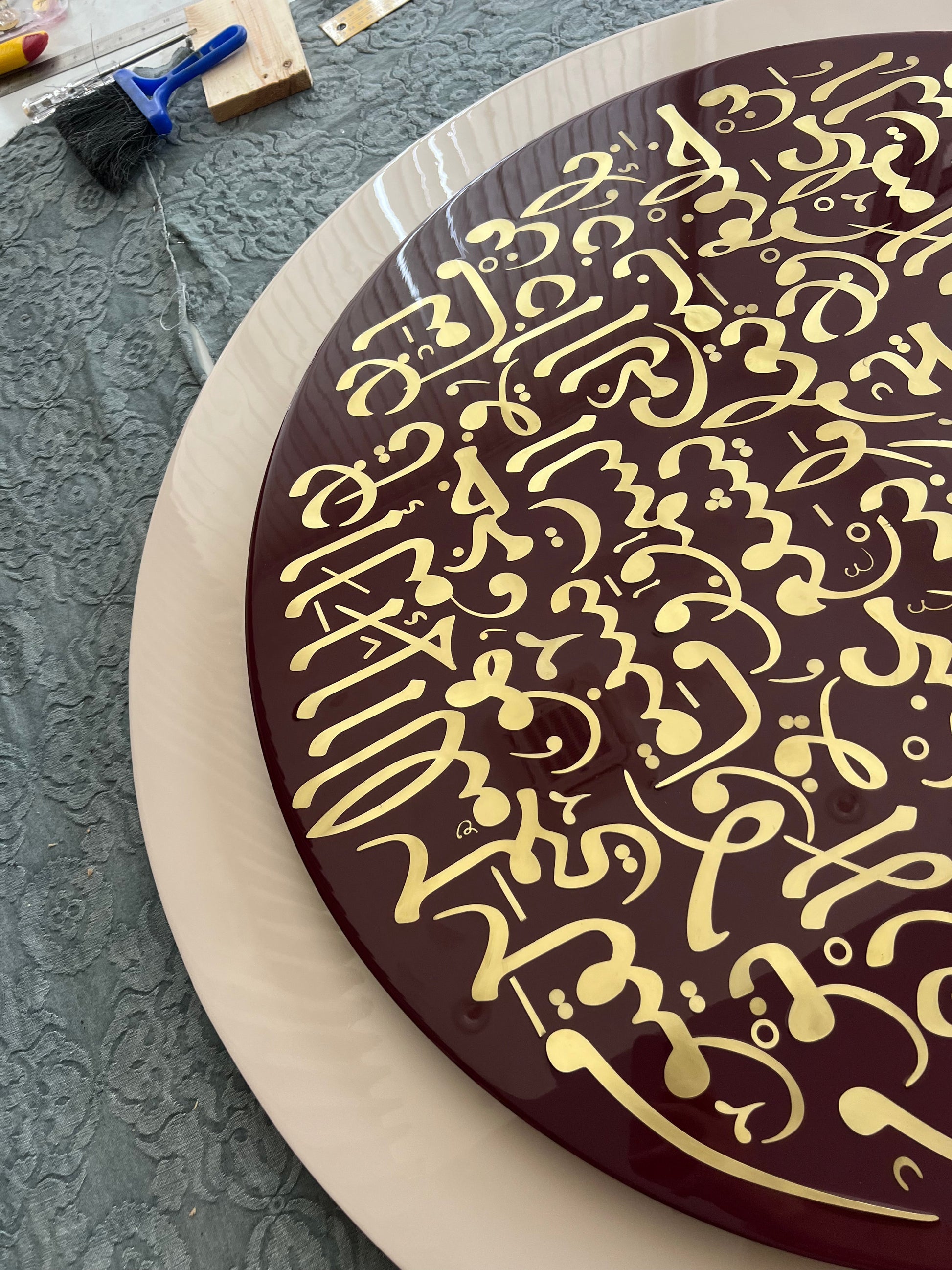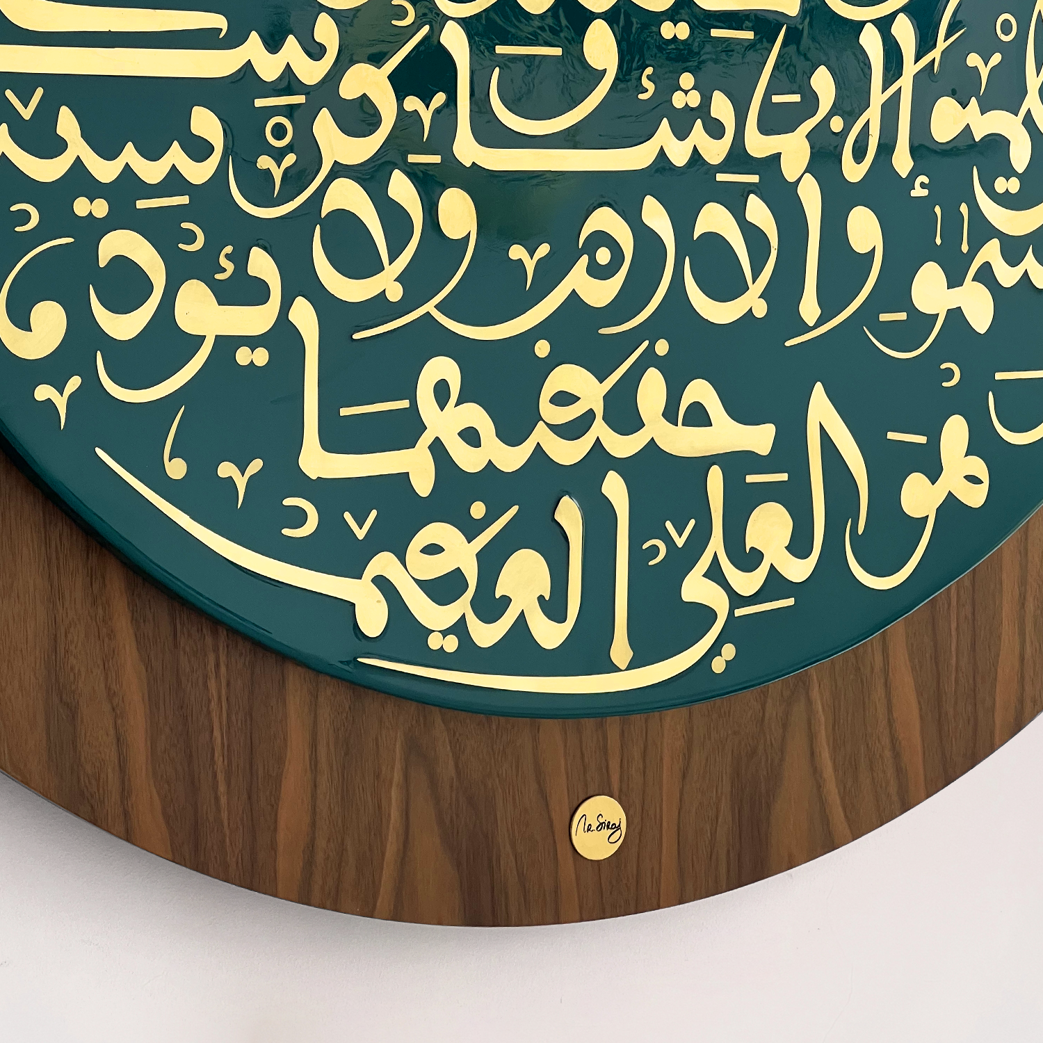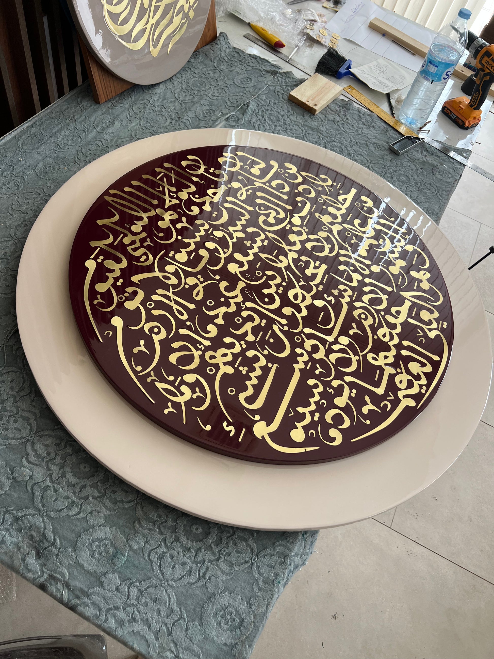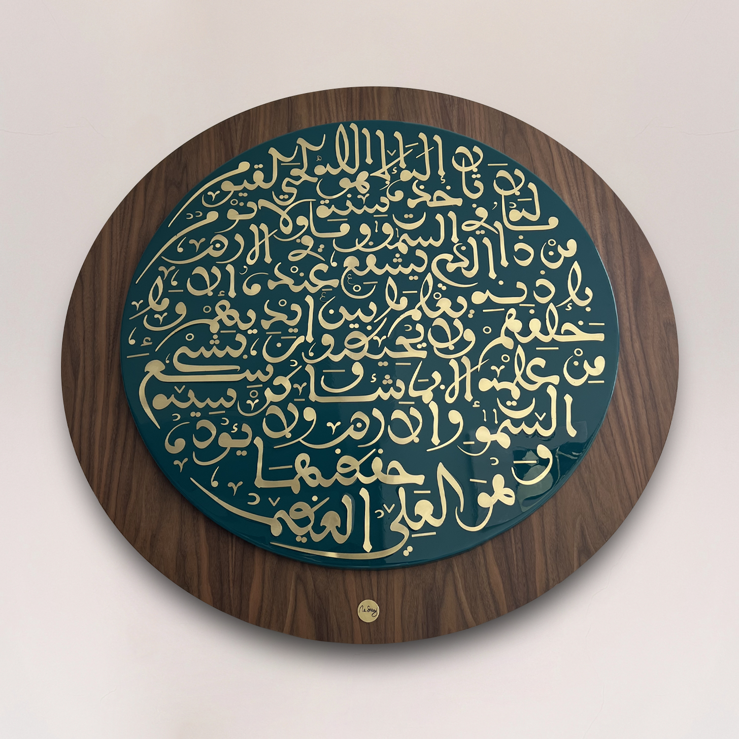 The virtue of the content: This artwork, inspired by Ayat al-Kursi (The Verse of the Throne), is a breathtaking display of intricate calligraphy and artistic mastery. Its bold yet graceful composition, combined with luxurious detailing, creates a visually captivating centerpiece. The carefully balanced design draws attention to the depth and significance of this revered verse, making it a statement of elegance and spirituality in any space.