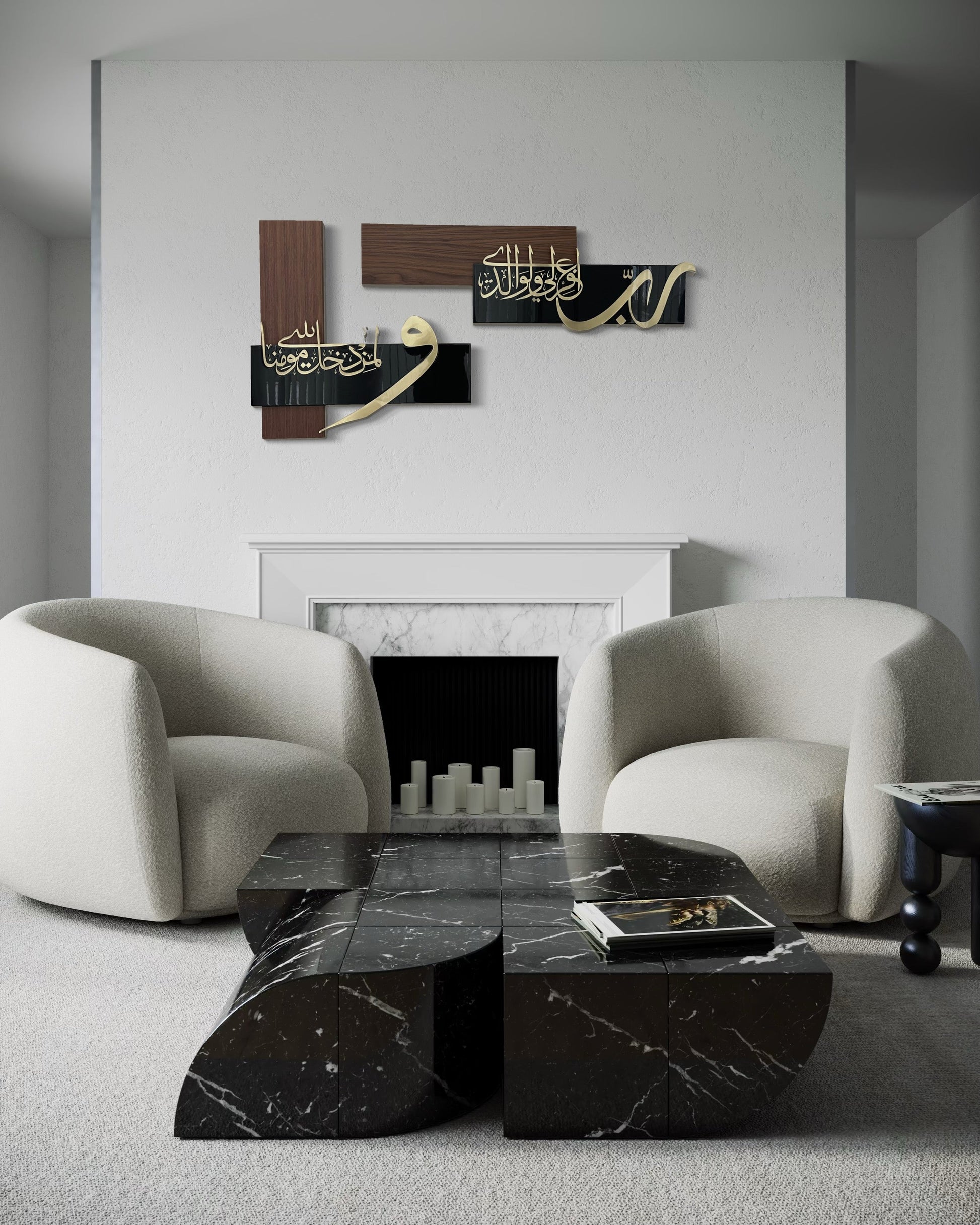 The central element of this artwork features brass calligraphy embracing wooden form, symbolizing the home—not merely as a structure, but as a sanctuary of faith. It reflects the verse's deep invocation for divine mercy upon oneself, one’s parents, and every believer who enters with sincerity and light in their heart.